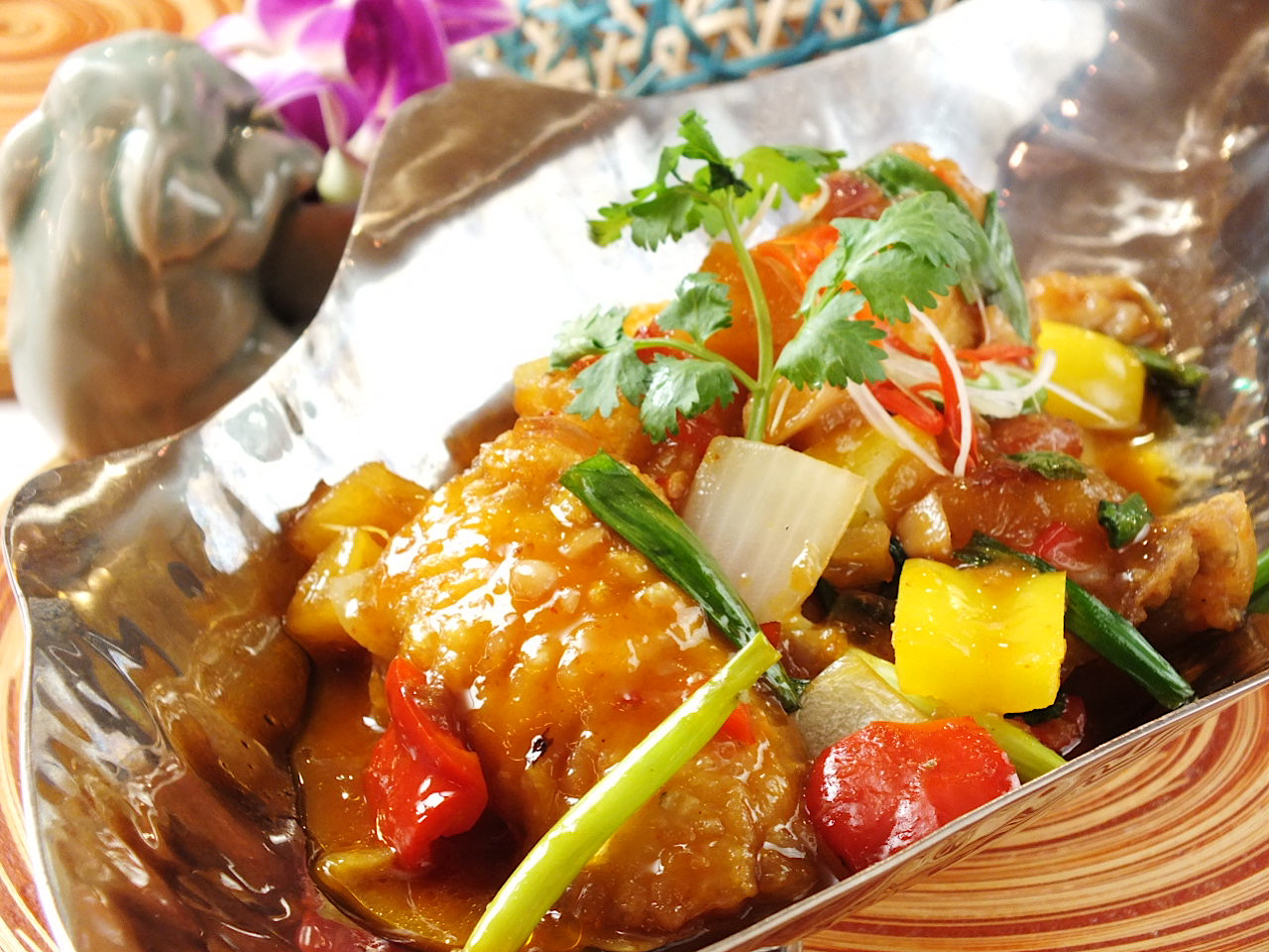 使用被称为梦幻之鱼的石斑鱼,使用新鲜圣女果,辣椒,柠檬等三种食材,制成可口的酸辣甜酱汁,呈现的热带优质料理。