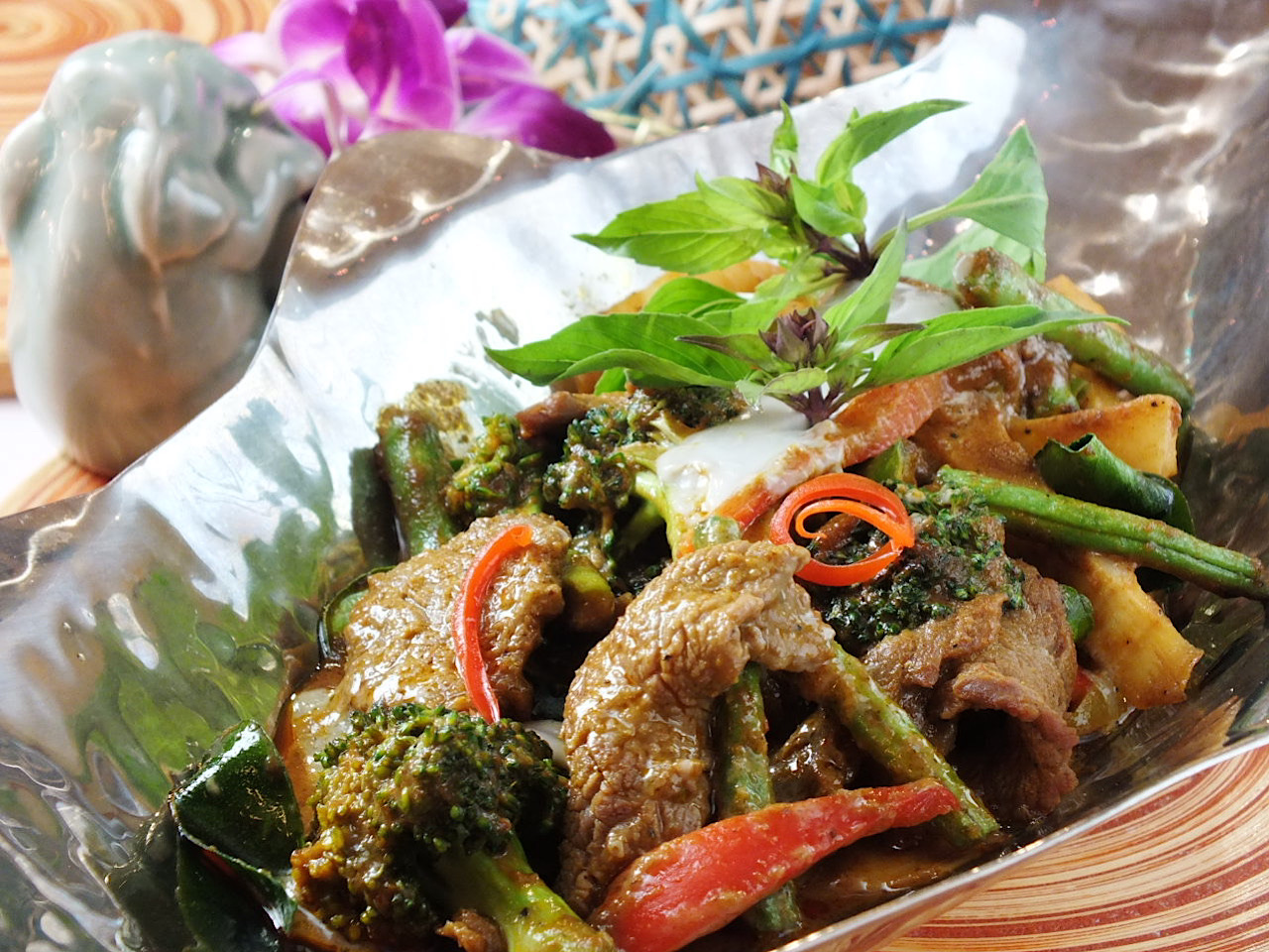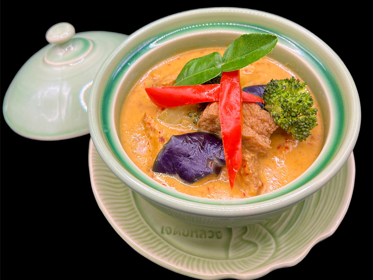 使用日本最顶级的黑毛和牛,采用泰国人气料理绿咖喱作为底味,配以各种时令蔬菜炒制而成。佐以青辣椒的辣味及各种香料和椰奶的甜味使牛肉的味道更为馥郁美味。