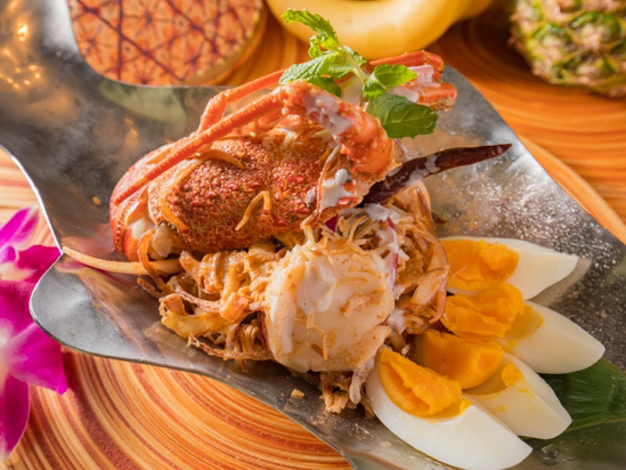 泰国南部的传统料理。香蕉的花蕾便于食用,口感清脆。加入辣椒和坚果的惊喜口感。伊势龙虾口感甜美软嫩,色泽艳丽诱人。