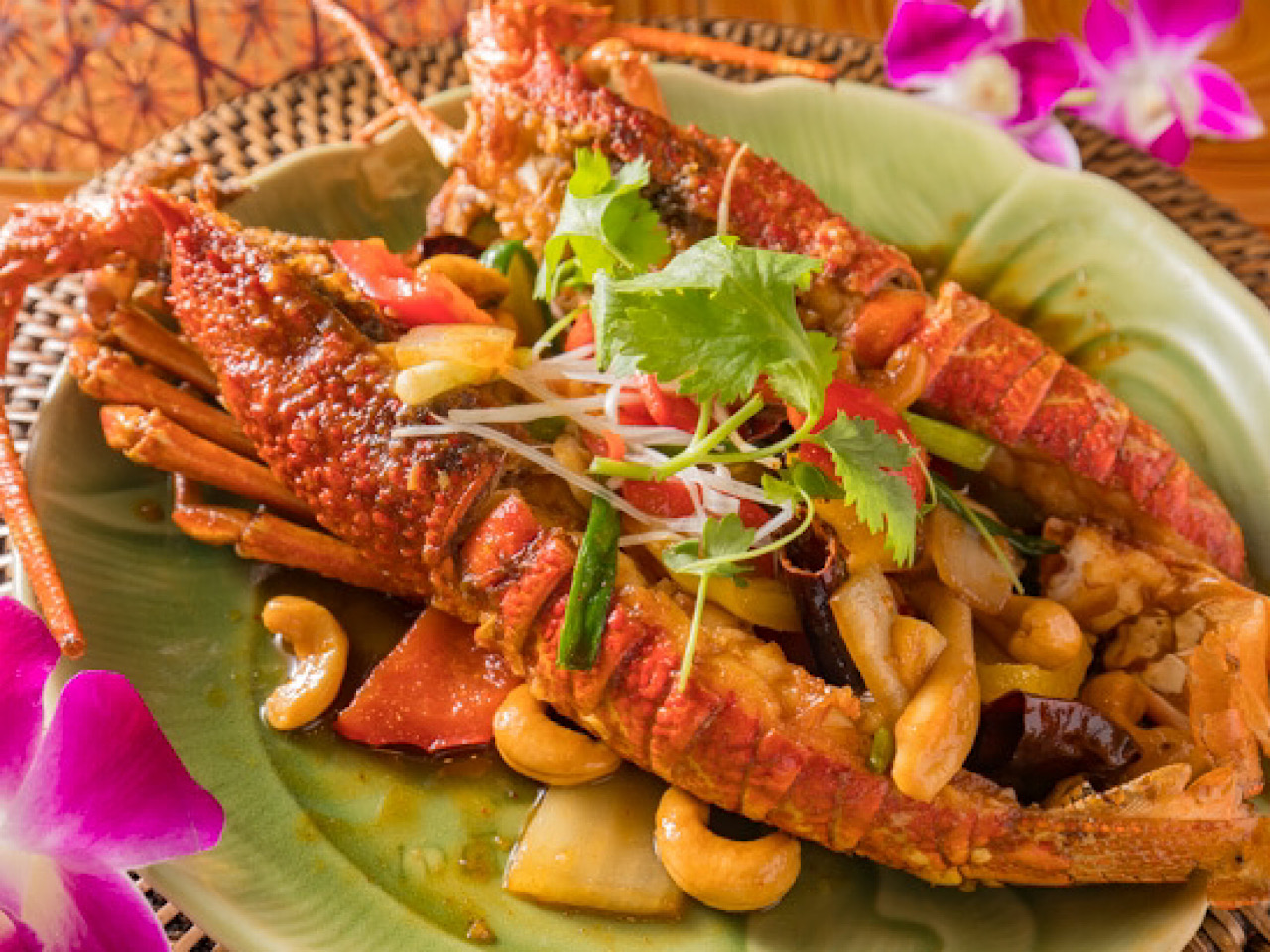 将硕大的龙虾和醇香的腰果配以新鲜的时令蔬菜,利用优质鲜美的蚝油和泰国酱油一起炒制而成的美味。