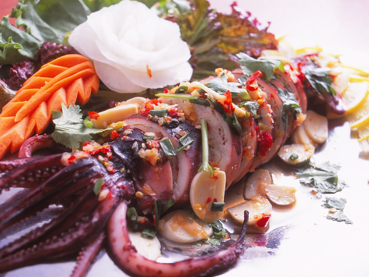 使用一整只新鲜的乌贼,内里填入满满猪肉炒粉条和香菜根后进行蒸煮。配以红辣椒,香草和鱼露等特制的酱汁一起食用更美味。