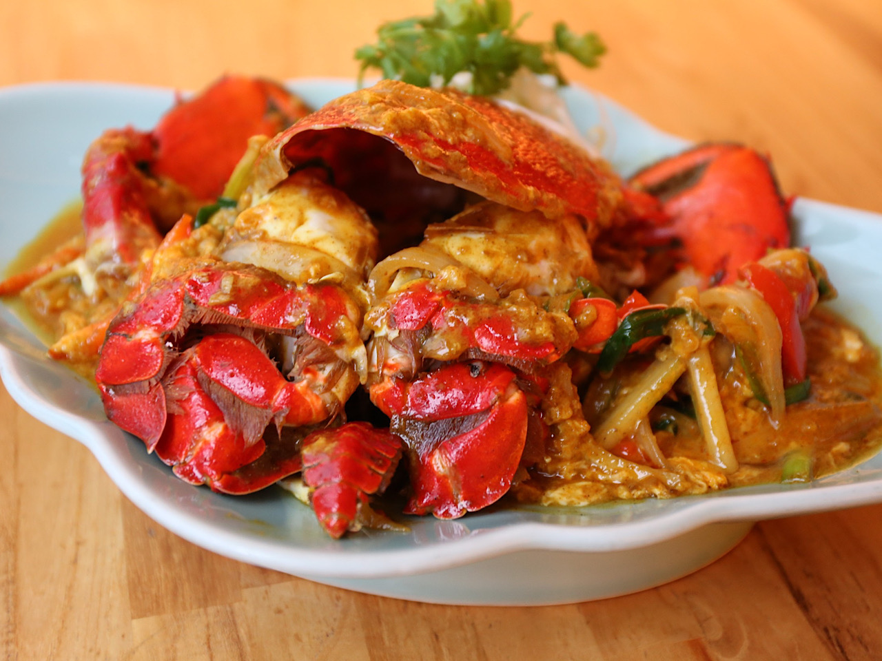 将螃蟹掰开,蟹肉甜美紧实,蟹肉丝丝软嫩,美味异常。配以泰国人气的海鲜料理蟹酱。
